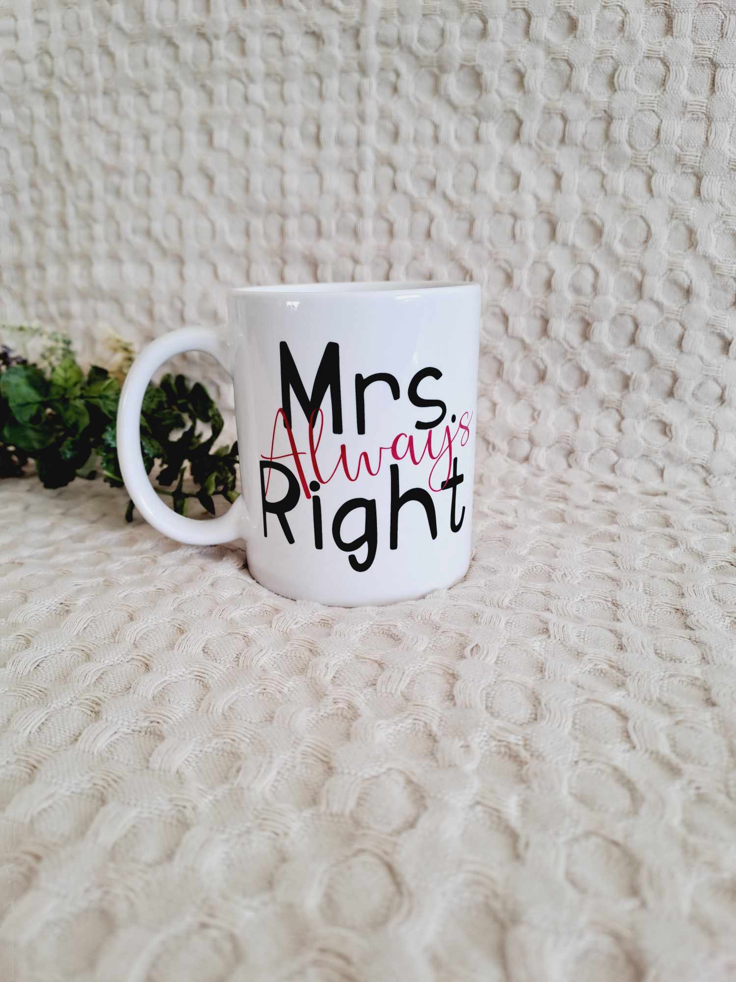 Double-Sided Design: Embrace the playful "Mrs. 'Always' Right" design from any angle, bringing a smile to your face with every sip. Kickstart your morning with a chuckle and a gentle reminder of your unique charm and wit.