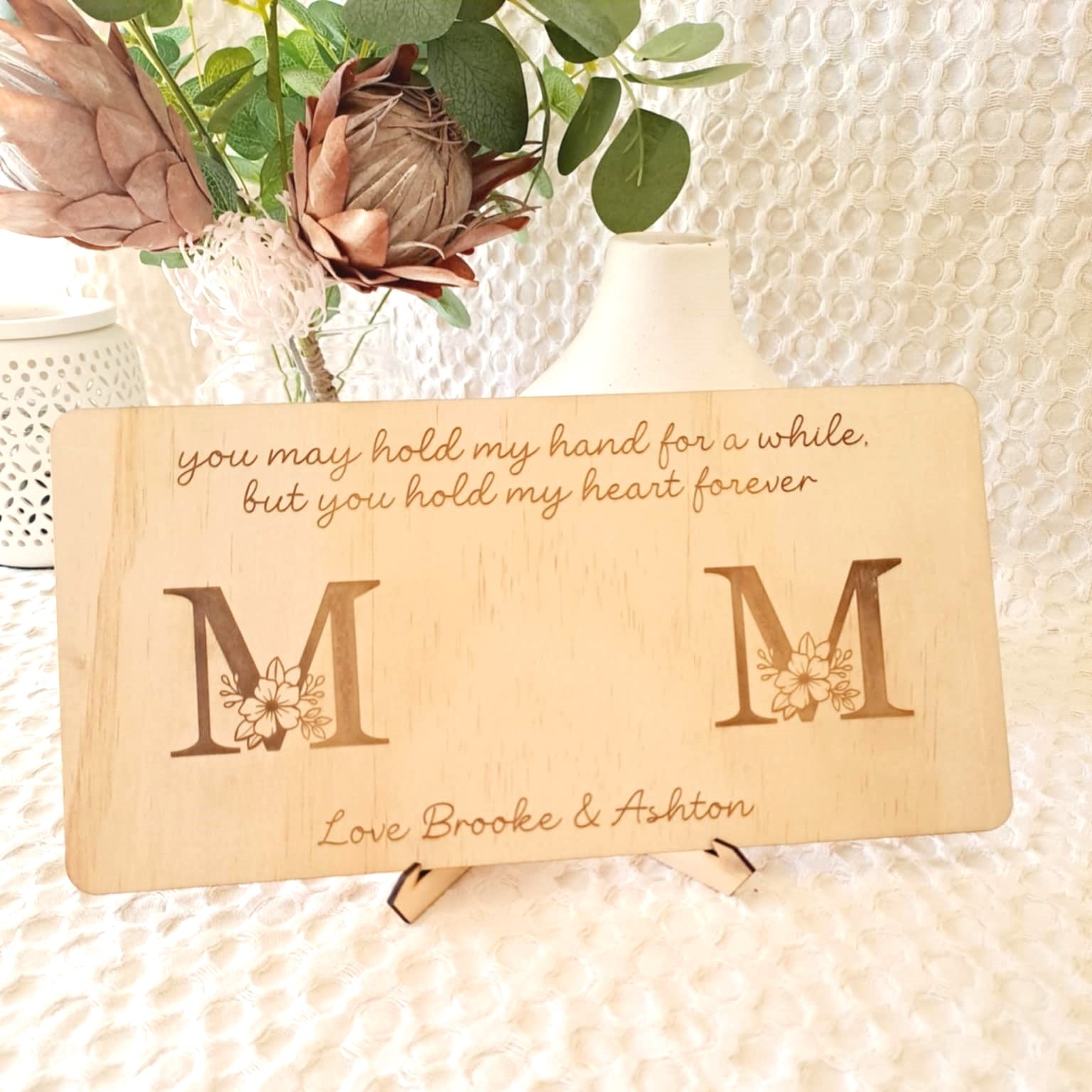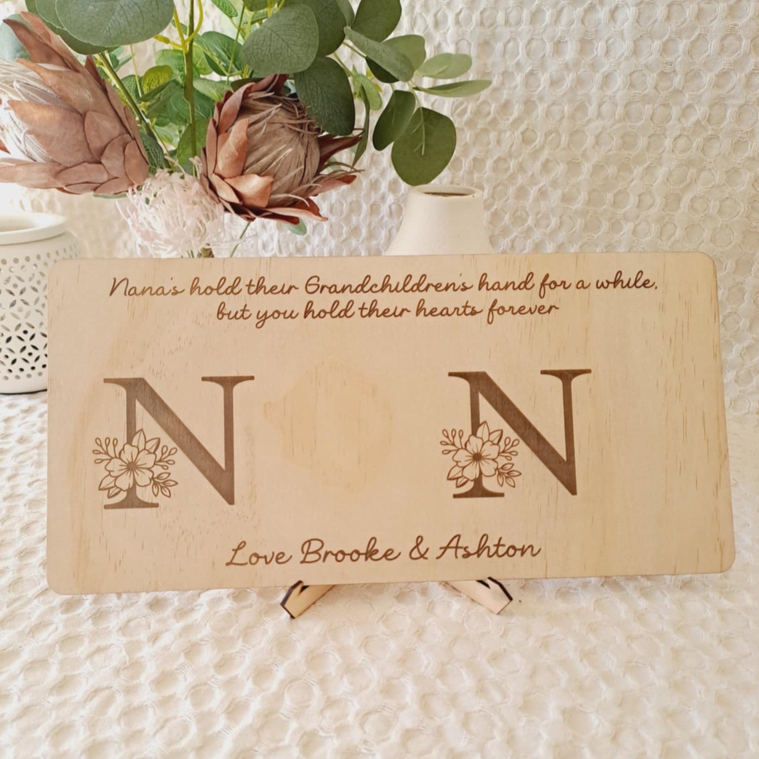 Celebrate the love between generations with our "These Hands Hold" Handprint Plaque, a heartfelt keepsake designed to capture little hands in the most beautiful way. Crafted from timber, this plaque features an engraved quote about the precious bond of family, with the letters of "Mum" or "Nana" partially left open for tiny handprints to complete the design.