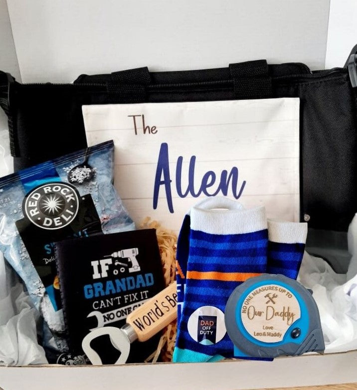 Surprise Dad with the Ultimate Gift Pack a thoughtfully curated collection of personalised essentials and fun treats. This all-in-one bundle is designed to make him feel appreciated and loved, whether it's for Father's Day, his birthday, or just because. Packed in our Signature Personalised Esky/Cooler Bag, this gift pack is sure to bring a smile to his face and add convenience to his daily routine.